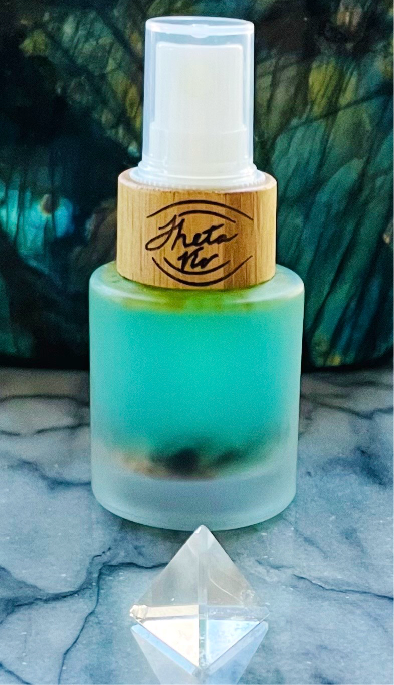They are hand poured into a beautiful petite designer frosted glass with bamboo lid spray-on applicator bottle. They are molecularly structured with Sound, Handmade with Interconnected Intention and Infused with Love.